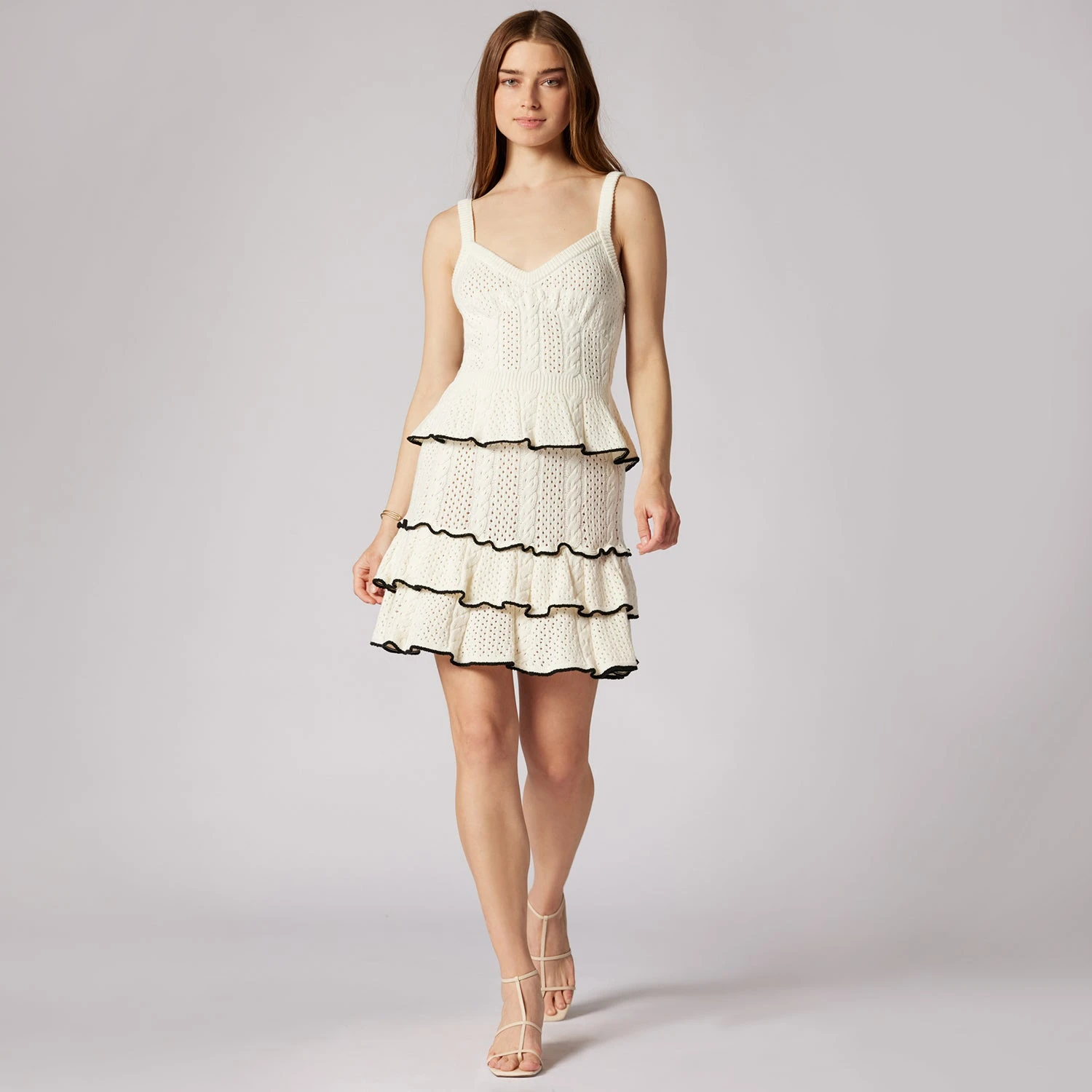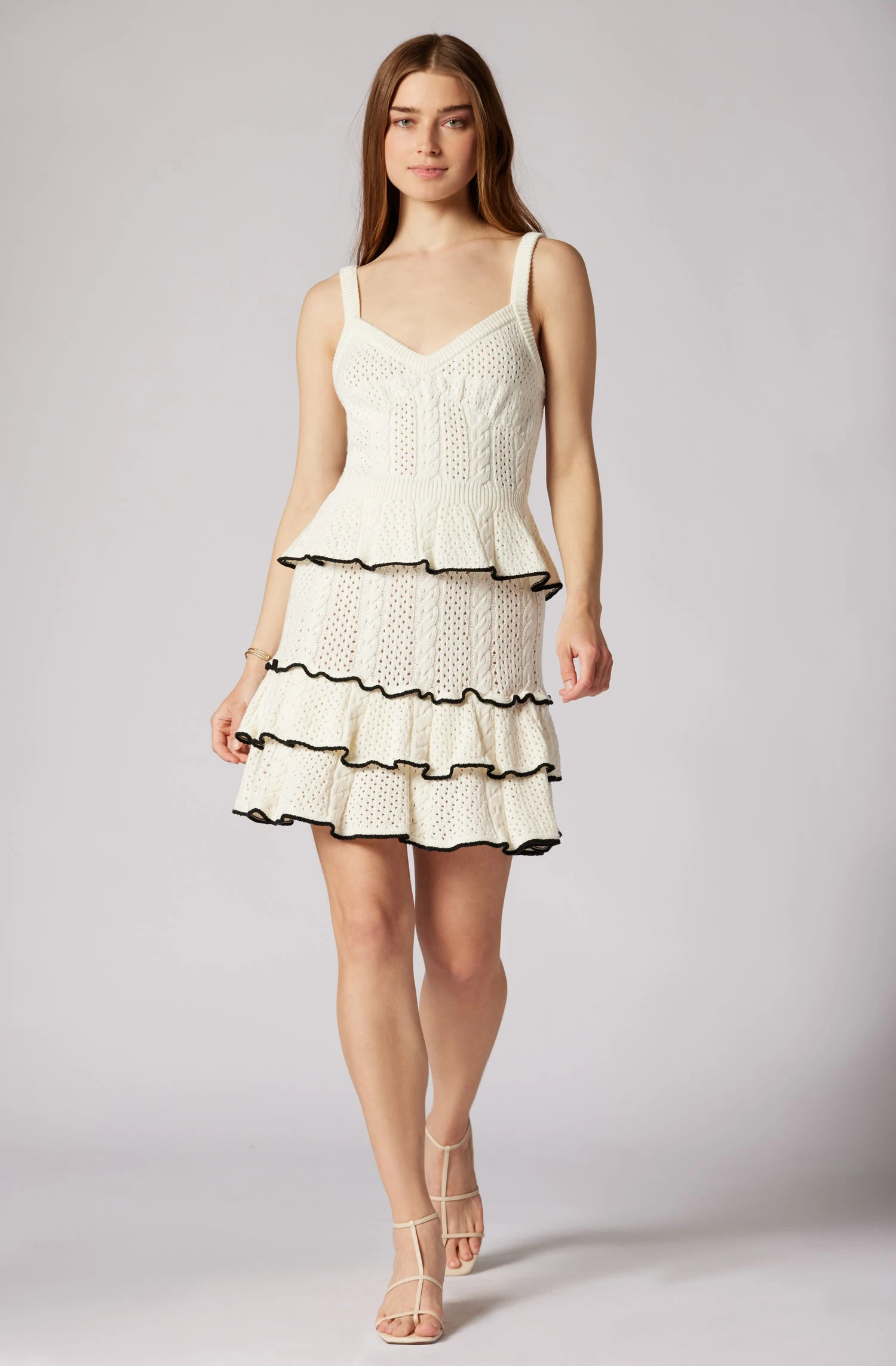The Andie is a romantic cable pointelle sweater top with a ruffled hemline that exudes summer playfulness. Wear it with its perfect match The Tanya for a monochromatic summer look.