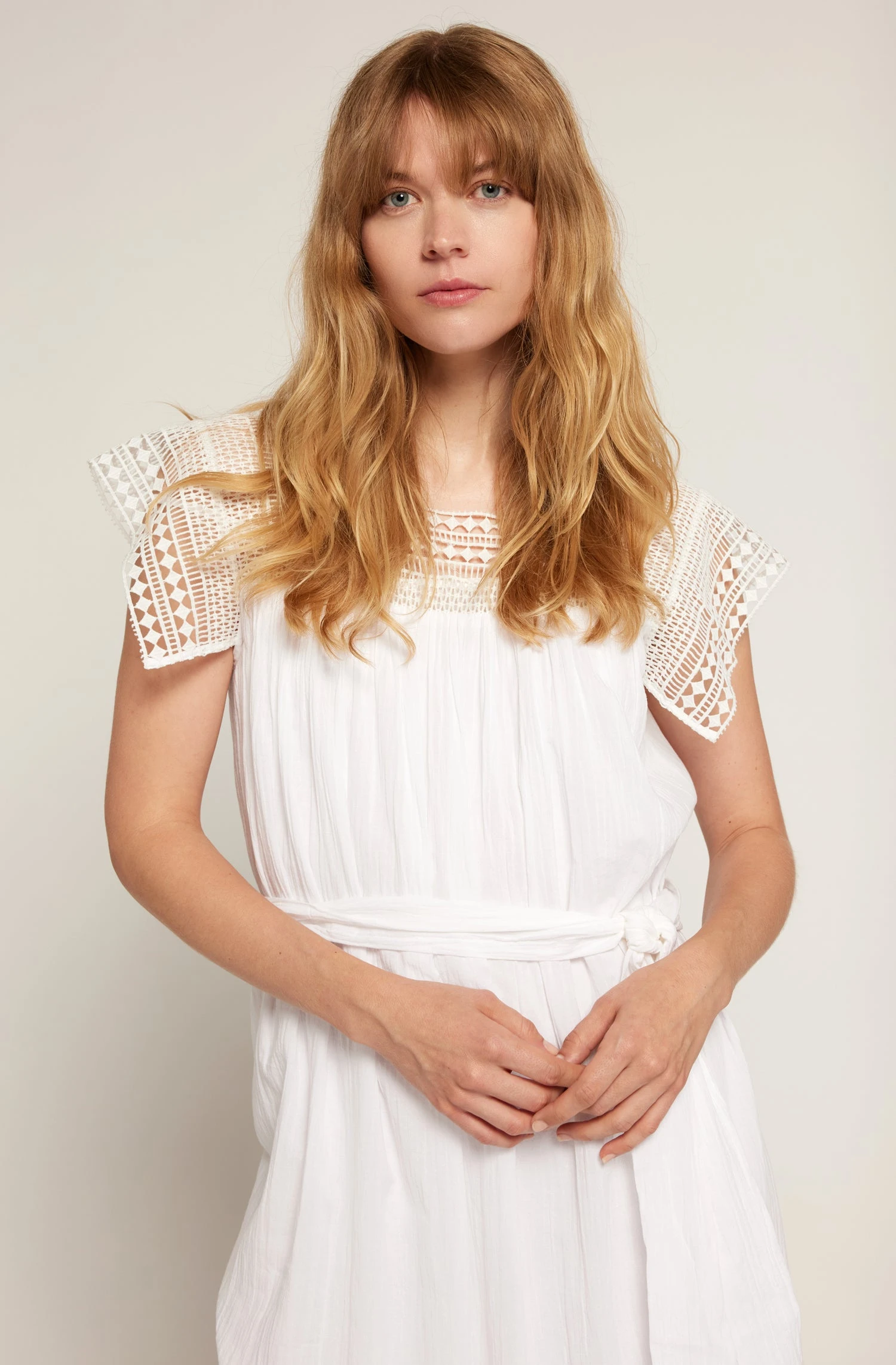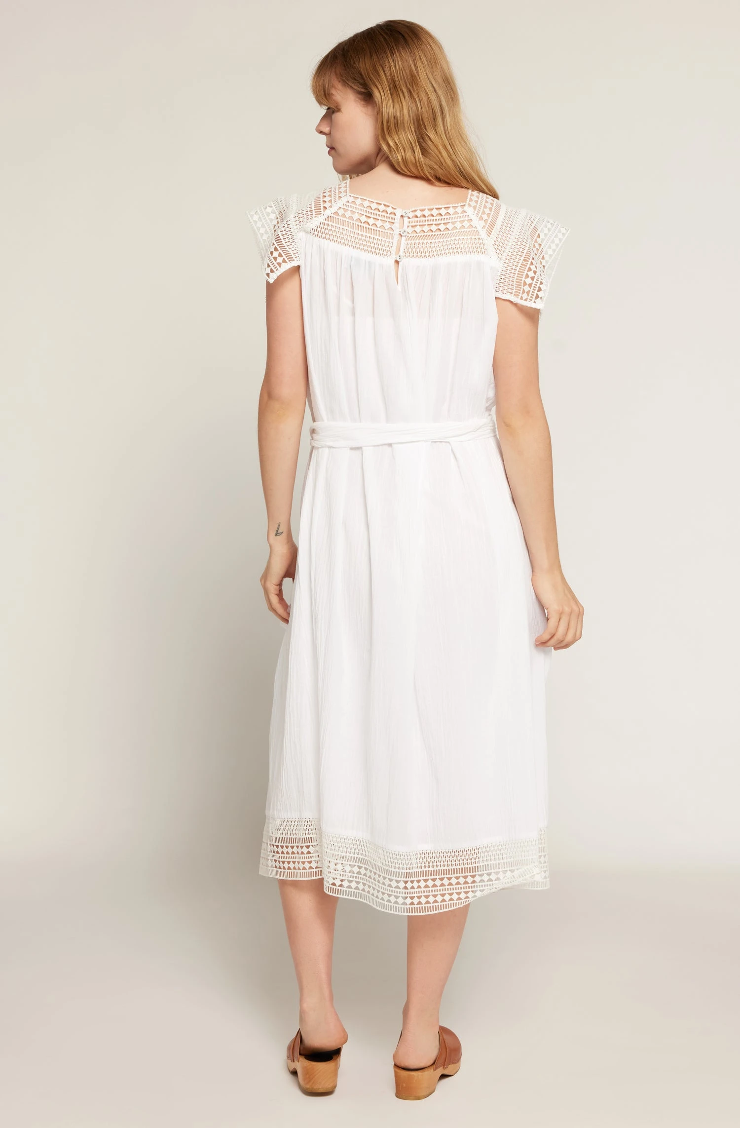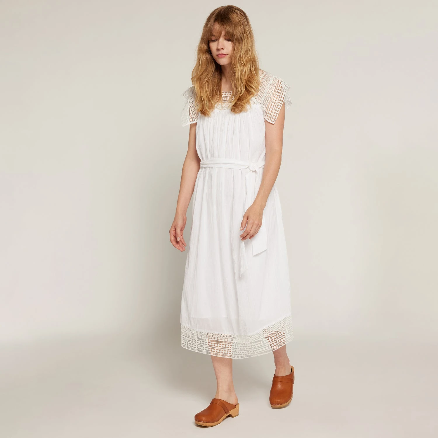 The Aspen feels straight out of a romance novel with its whimsical silhouette and lightweight cut. This cotton design features hand-embroidered details in the bodice and the hemline as well as a tie belt for added shape.