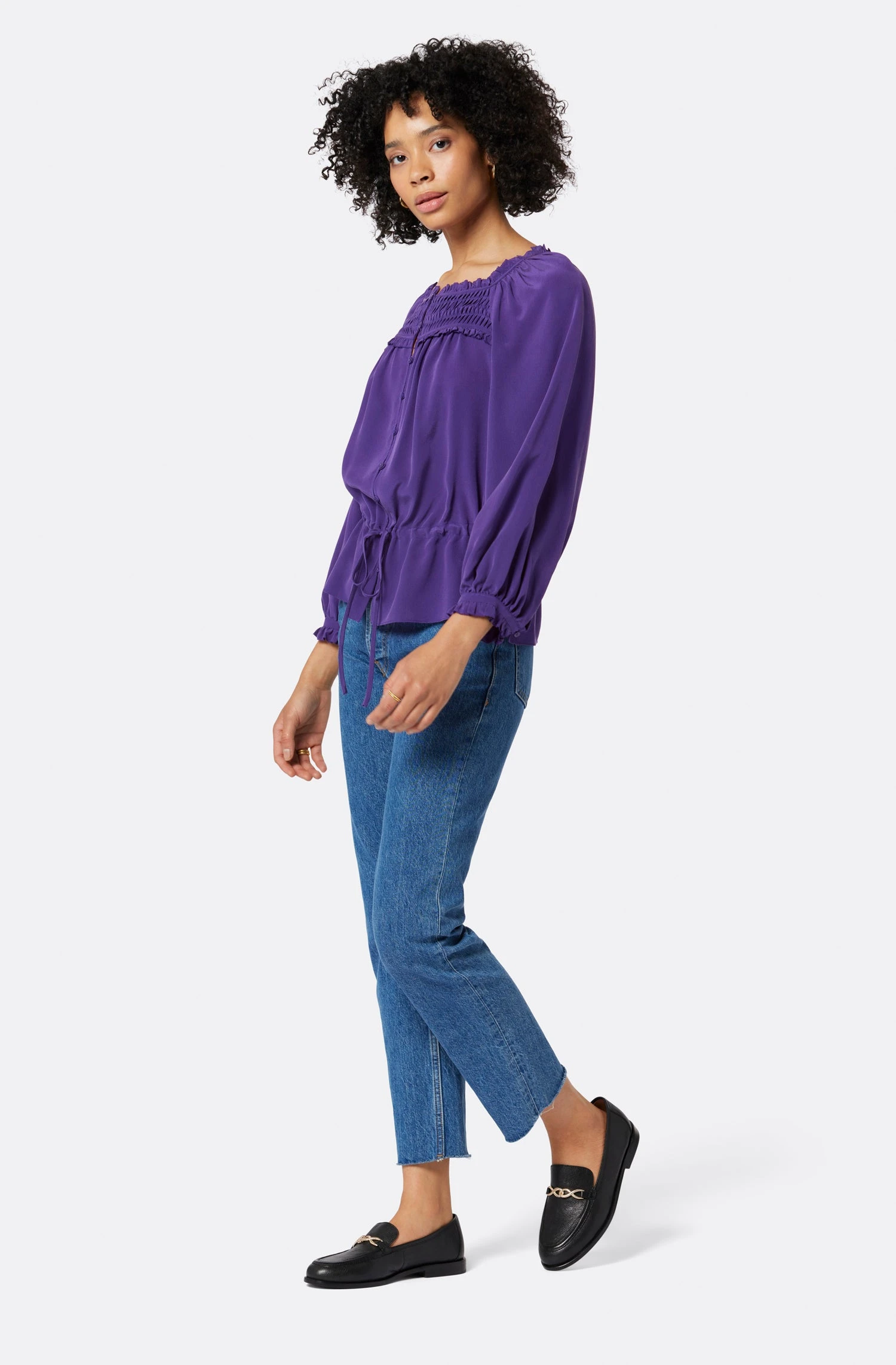 The Asseline is the most lively fall top out there thanks to its fluid shape and rich color. The way this silk design sits on the body also accentuates details like the smocked square neckline, string tie belt, and ruffled cuffs.