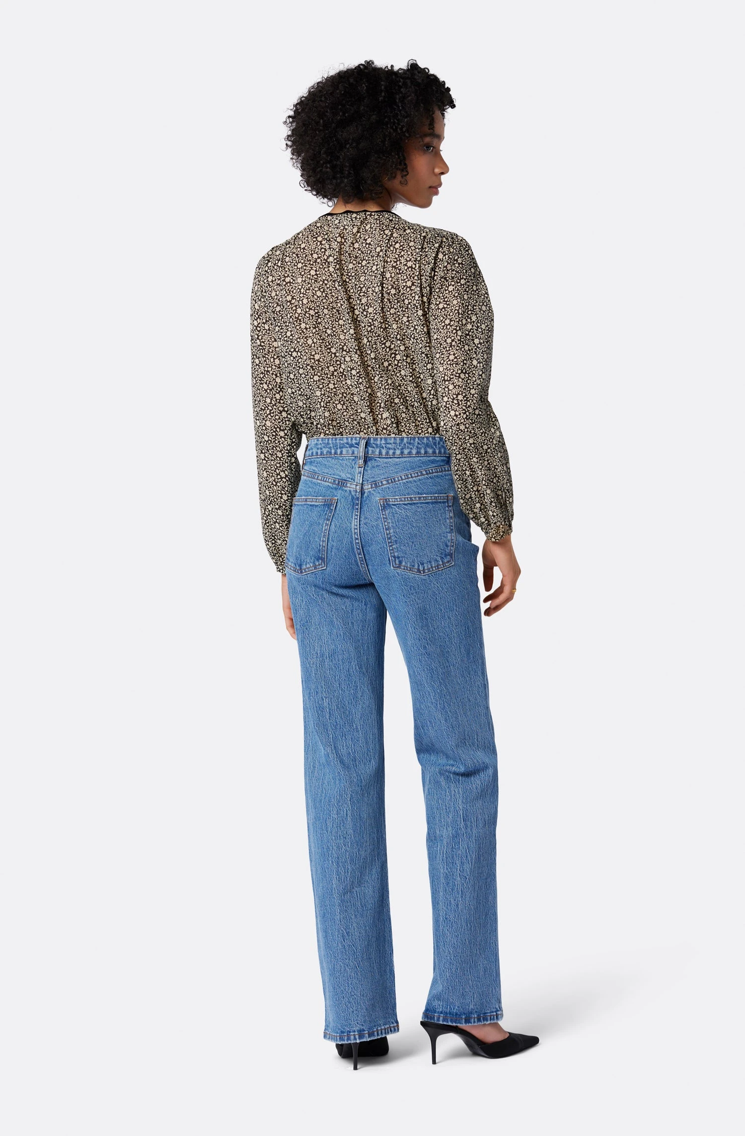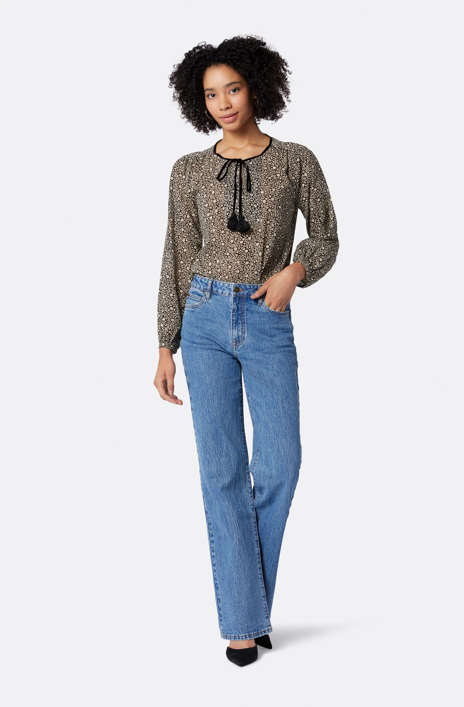 A beautiful blouse with a striking pattern, black necktie, and voluminous sleeves. This relaxed design is a perfect addition to your fall wardrobe since it looks great as part of a layered look and can easily level up your everyday style.