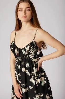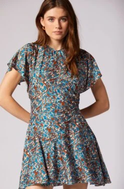A lightweight cotton crepe dress with a playful silhouette, a ruffled neckline, and stitching details around the bodice. This dress is the perfect foundational piece for a fall layered look and can look casual with a nice pair of boots.