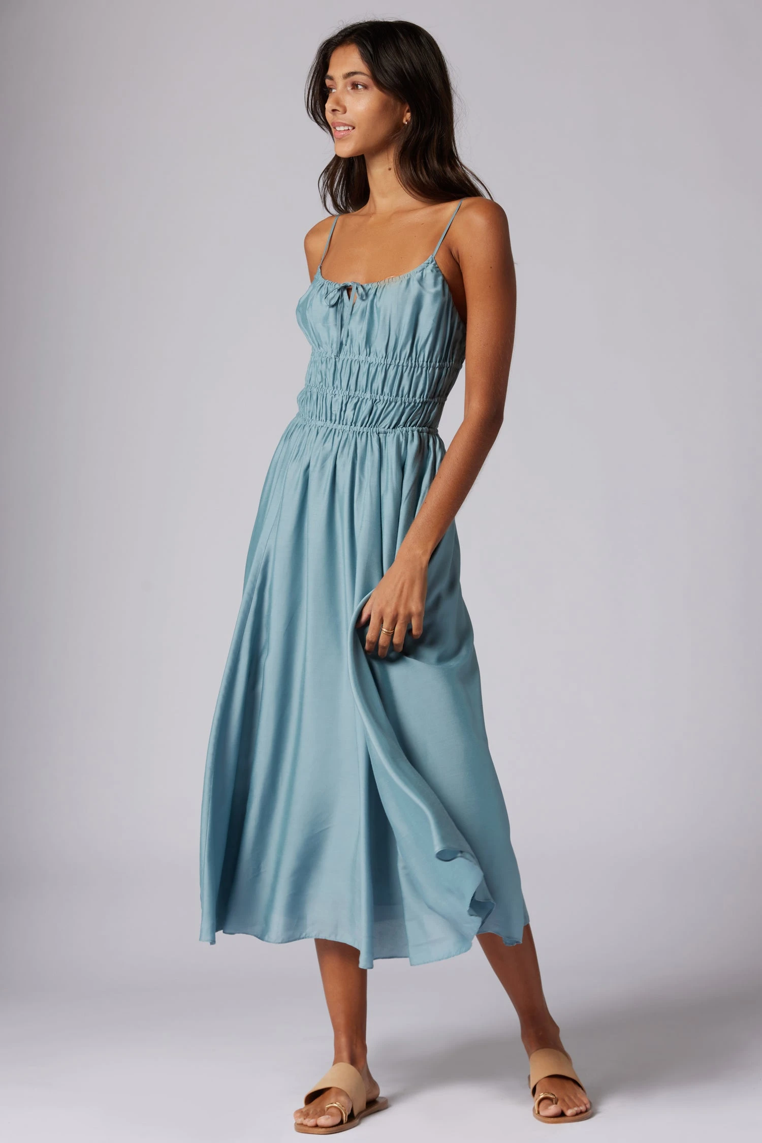 The Elena looks straight out of a vintage romance novel. This flattering silk satin dress features ruching on the bodice with a full, flowing skirt and looks great with sandals while on vacation.