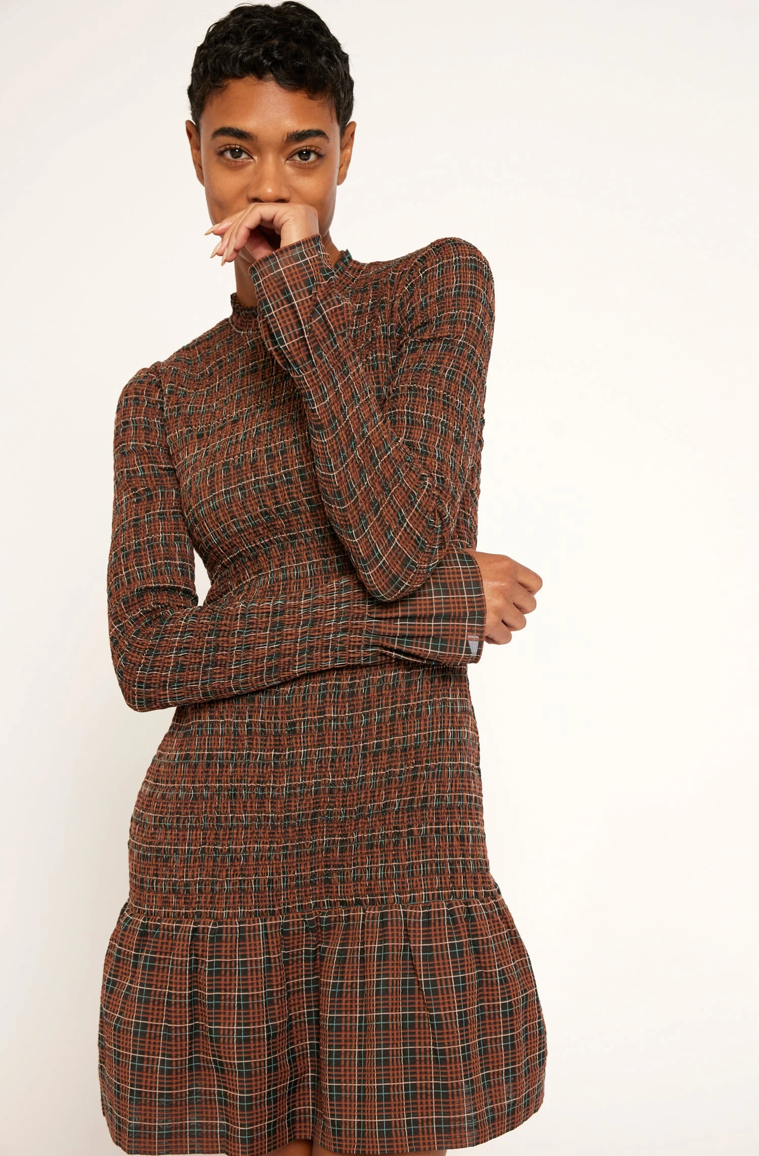 The Houda brings a lot of ‘70s flair thanks to its retro silhouette. Bouncy skirt, bell cuffs, and a ruffled collar, this fall dress looks great with boots and a denim jacket.