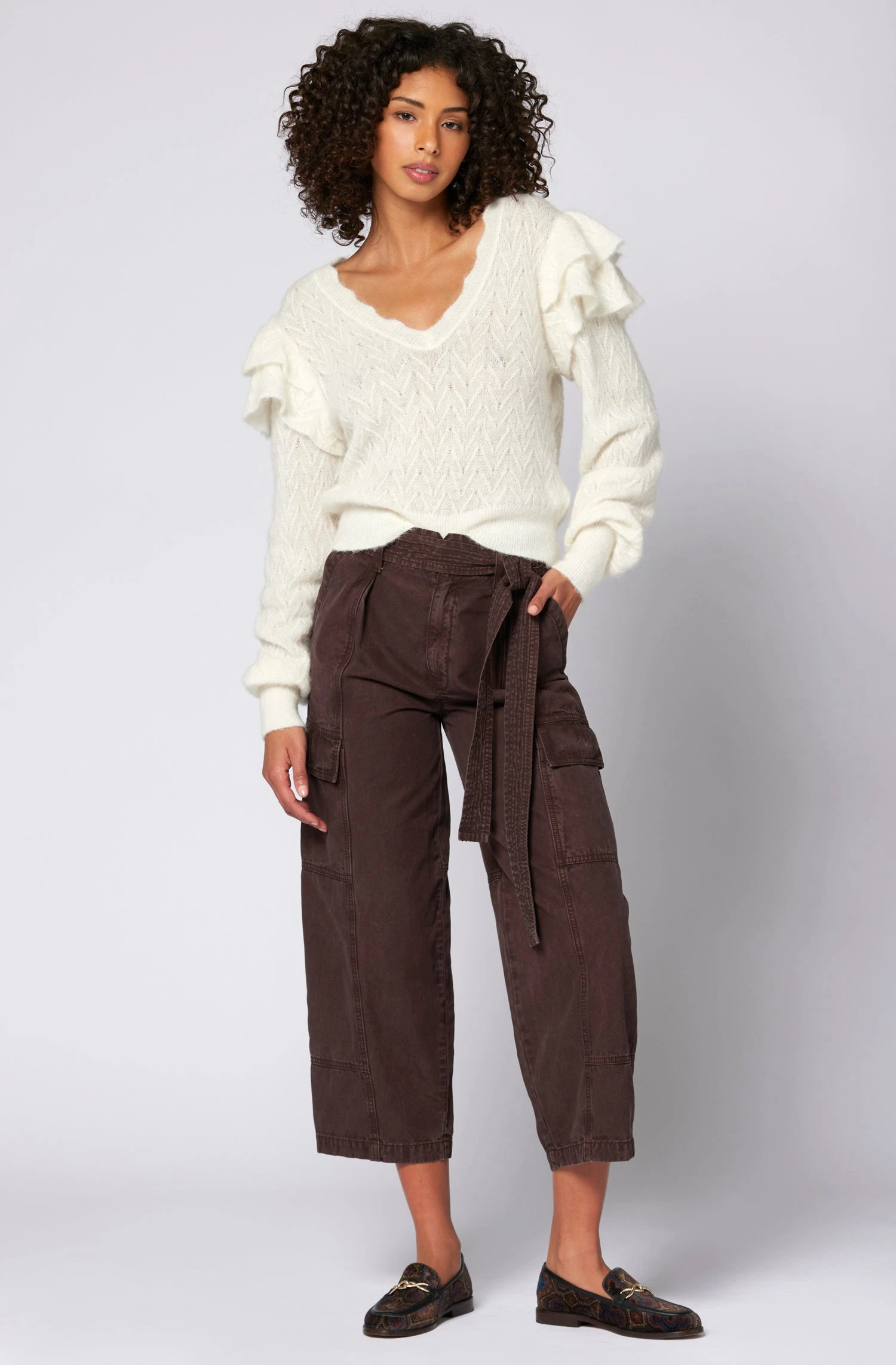 Make quite the statement with The Inez and its standout shoulder frills and oversized sleeves. This lightweight knit can be paired down with denim, or leveled up with a skirt or trouser.