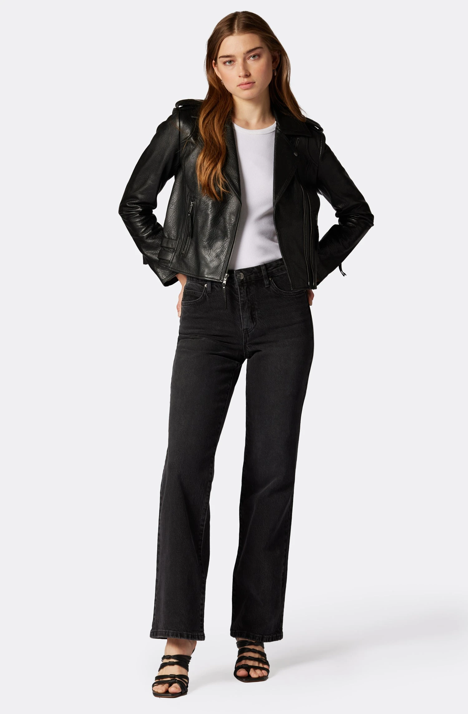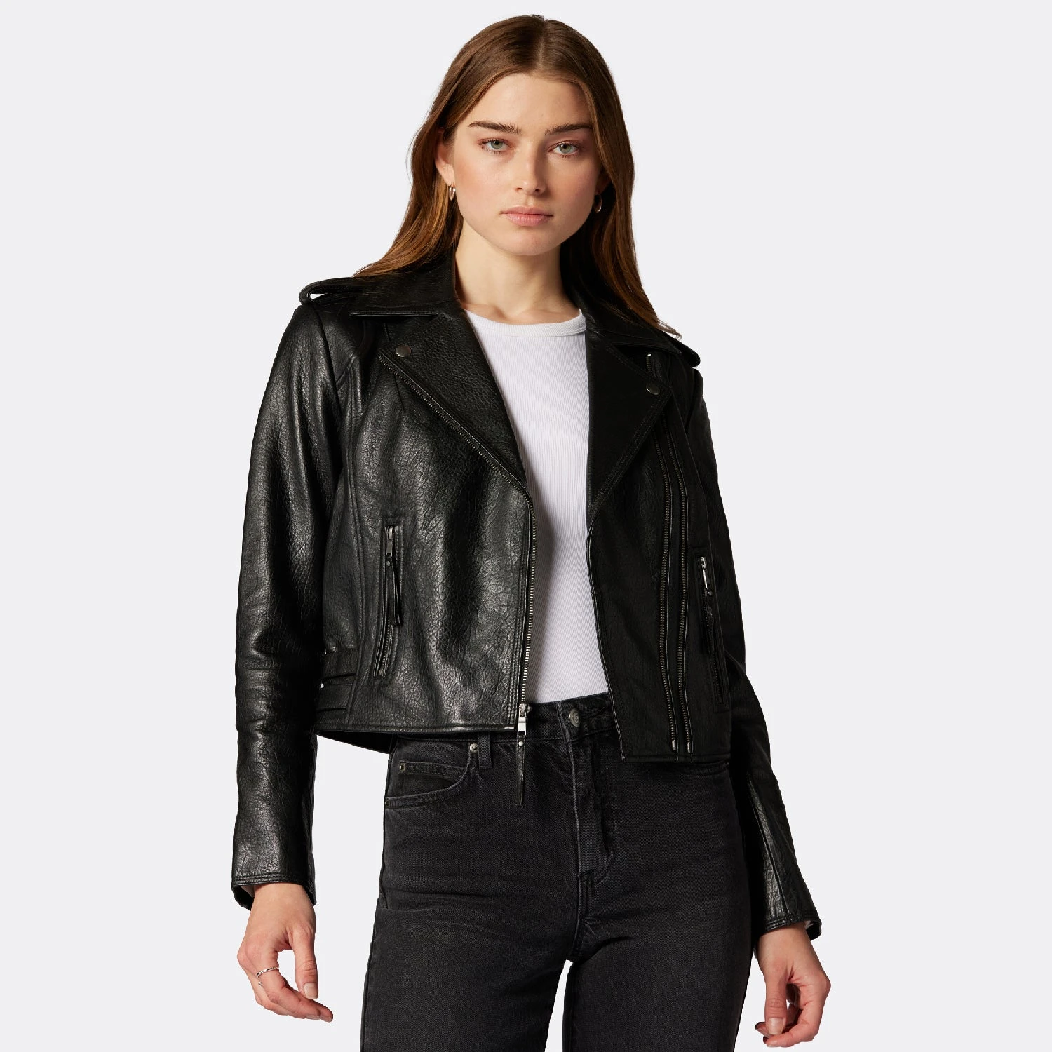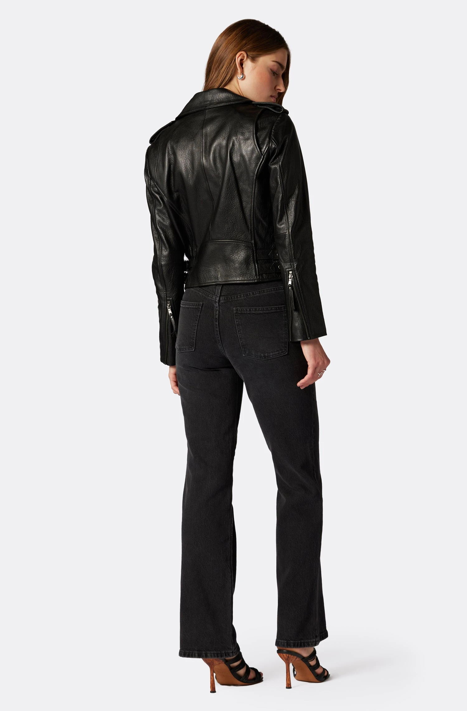 The classic moto jacket – fitted and slightly cropped and crafted from the softest leather the Leolani looks just as good over jeans as it does over a summery dress.
