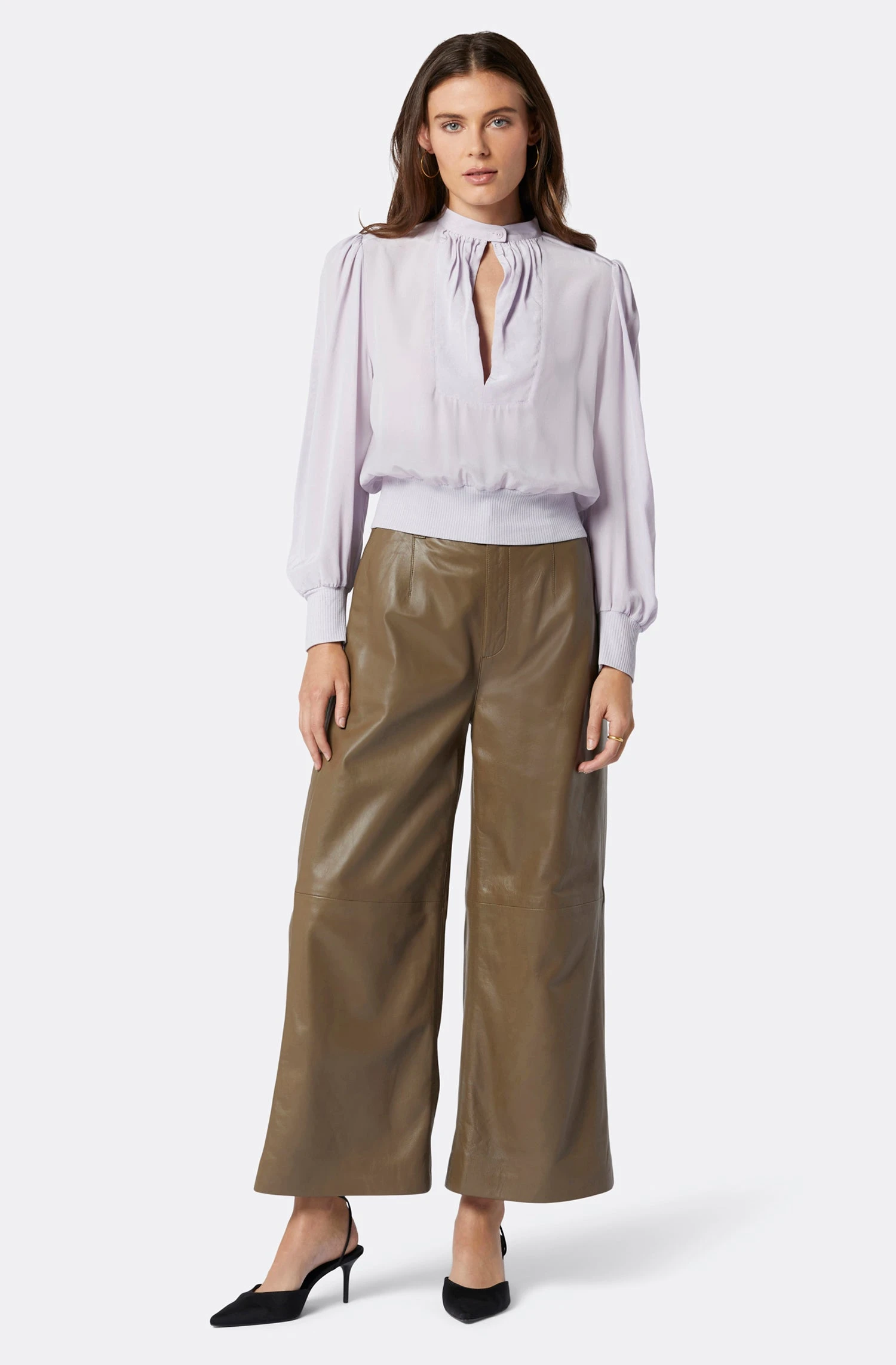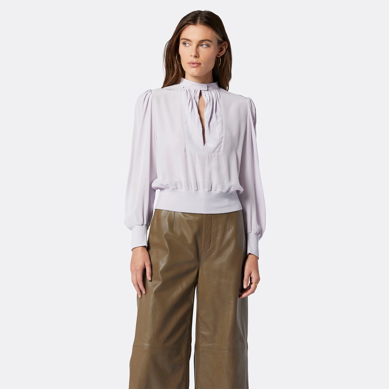 The Iyanes is a walking Parisian dream with all the romantic details it features. Voluminous sleeves, keyhole neckline, and the gentle gatherings add a touch of whimsicality to this cropped silk top while the rib waistband and cuffs add a blousant effect.