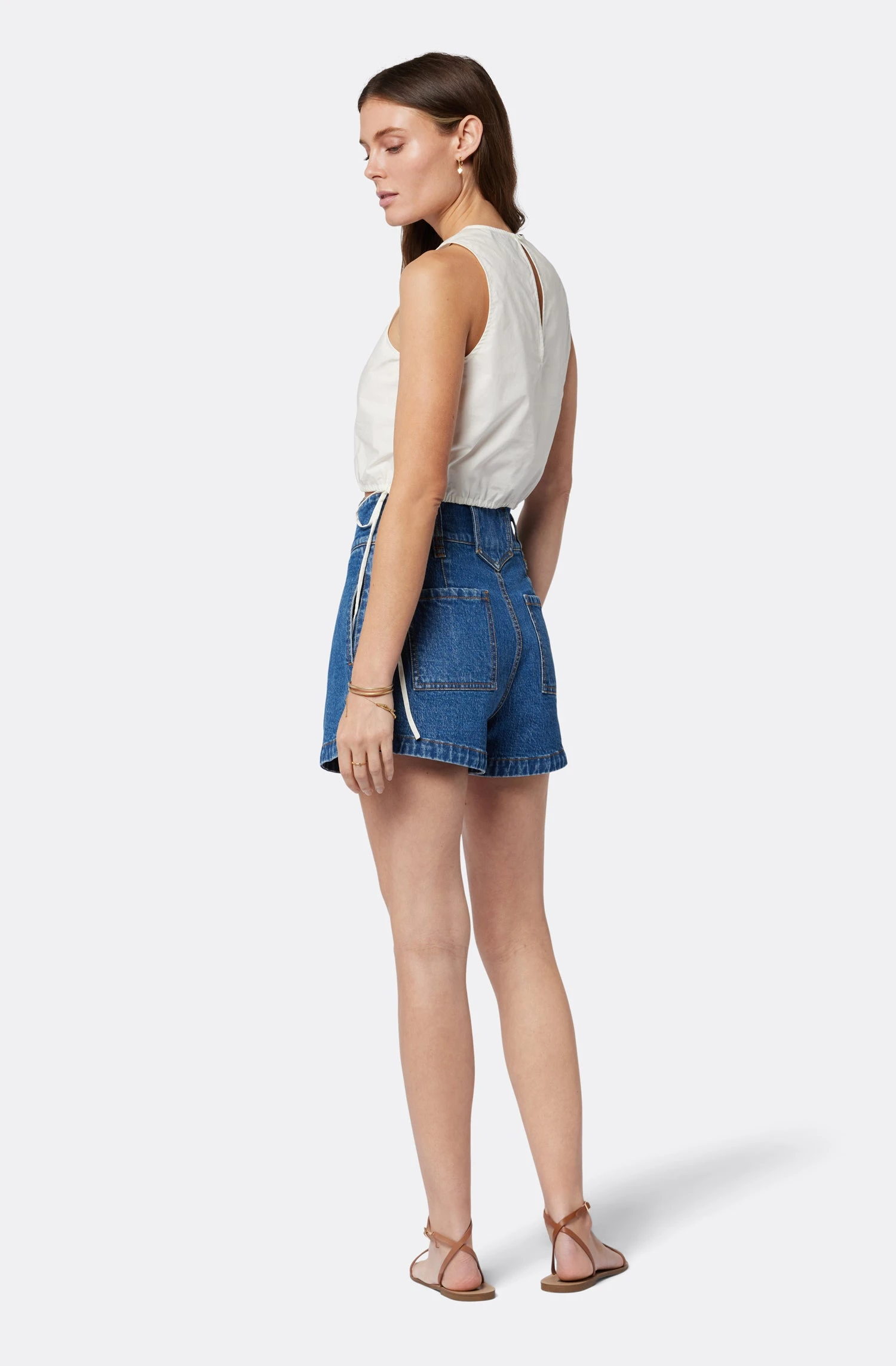 The Tess is a playful cotton top with an adjustable drawstring around the hemline and a cropped silhouette.